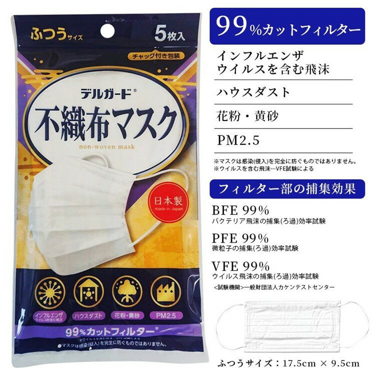 ●フィルター部の捕集効率 ・BFE:99%(バクテリア飛沫の捕集(ろ過)効率試験) ・PFE:99%(微粒子の捕集(ろ過)効率試験) ・VFE:99%(ウイルス飛沫の捕集(ろ過)効率試験) 内容量:5枚入 製造国:日本 【サイズ】 175mm×95mm(±5mm) 【対象】 かぜ、花粉、ほこり等 99%カットフィルター ・インフルエンザウイルスを含む飛沫 ・ハウスダスト ・花粉・黄砂 ・PM2.5 ■ノーズフィッター:顔の形にぴったりフィットするノーズフィッターで、隙間からの侵入を防ぎます。