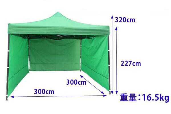 さらに取り外しが可能な横幕が3面付き!運動会などのイベントやキャンプ、バーベキューなどに大活躍!【商品詳細】セット内容:本体フレーム、テントカバー、横幕×3枚サイズ(約):幅300×奥行き300×高さ320cm重量(約):16.5kg材質:PVC、スチール(粉体塗装)※大人2人以上で組み立ててください。